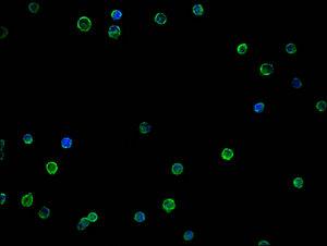 Immunofluorescence staining of THP-1 cells with CSB-MA013563A0m at 1:100, counter-stained with DAPI. The cells were blocked in 10% normal Goat Serum and then incubated with the primary antibody overnight at 4°C. The secondary antibody was Alexa Fluor 488-congugated AffiniPure Goat Anti-Mouse IgG(H+L).