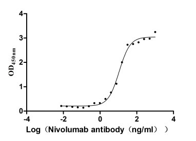 生物活性:①Measured by its binding ability in a functional ELISA. Immobilized PD-1 at 2 μg/ml can bind Anti-PD-1 recombinant antibody, the EC50 of human PD-1 protein is 6.087-7.854 ng/ml.②Measured by its binding ability in a functional ELISA. Immobilized PD-1 at 2 μg/ml can bind Nivolumab, the EC50 of human PD-1 protein is 9.713-12.39 ng/ml.