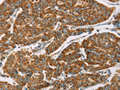 The image on the left is immunohistochemistry of paraffin-embedded Human breast cancer tissue using CSB-PA073786(DLL4 Antibody) at dilution 1/40, on the right is treated with fusion protein. (Original magnification: ×200)