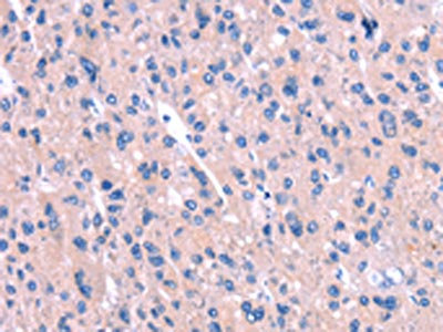 The image on the left is immunohistochemistry of paraffin-embedded Human liver cancer tissue using CSB-PA987804(ENPP4 Antibody) at dilution 1/15, on the right is treated with synthetic peptide. (Original magnification: ×200)