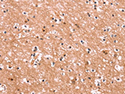 The image on the left is immunohistochemistry of paraffin-embedded Human brain tissue using CSB-PA987804(ENPP4 Antibody) at dilution 1/15, on the right is treated with synthetic peptide. (Original magnification: ×200)