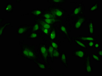 Immunofluorescence staining of Hela cells with CSB-PA010378OA109nforHU at 1:12.5, counter-stained with DAPI. The cells were fixed in 4% formaldehyde, permeabilized using 0.2% Triton X-100 and blocked in 10% normal Goat Serum. The cells were then incubated with the antibody overnight at 4°C. The secondary antibody was Alexa Fluor 488-congugated AffiniPure Goat Anti-Rabbit IgG(H+L).