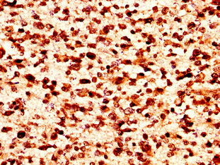 IHC image of CSB-PA010378OA109nforHU diluted at 1:50 and staining in paraffin-embedded human glioma performed on a Leica BondTM system. After dewaxing and hydration, antigen retrieval was mediated by high pressure in a citrate buffer (pH 6.0). Section was blocked with 10% normal goat serum 30min at RT. Then primary antibody (1% BSA) was incubated at 4°C overnight. The primary is detected by a biotinylated secondary antibody and visualized using an HRP conjugated SP system.