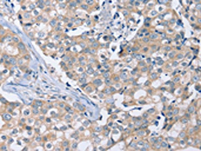 The image on the left is immunohistochemistry of paraffin-embedded Human breast cancer tissue using CSB-PA295602(PEA15 Antibody) at dilution 1/20, on the right is treated with fusion protein. (Original magnification: ×200)
