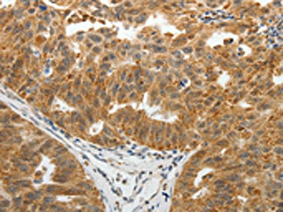 The image on the left is immunohistochemistry of paraffin-embedded Human ovarian cancer tissue using CSB-PA062278(SOCS7 Antibody) at dilution 1/30, on the right is treated with synthetic peptide. (Original magnification: ×200)