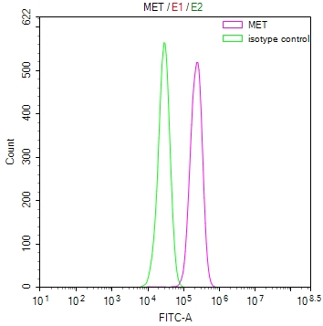 Overlay Peak curve showing Hela cells surface stained with CSB-RA013714MA1HU (red line) at 1:100. Then 10% normal goat serum was Incubated to block non-specific protein-protein interactions followed by the antibody (1μg/1*106cells) for 45 min at 4°C. The secondary antibody used was FITC-conjugated Goat Anti-Mouse IgG(H+L) at 1/200 dilution for 35 min at 4°C. Isotype control antibody (green line) was mouse IgG1 (1μg/1*106cells) used under the same conditions. Acquisition of >10,000 events was performed.