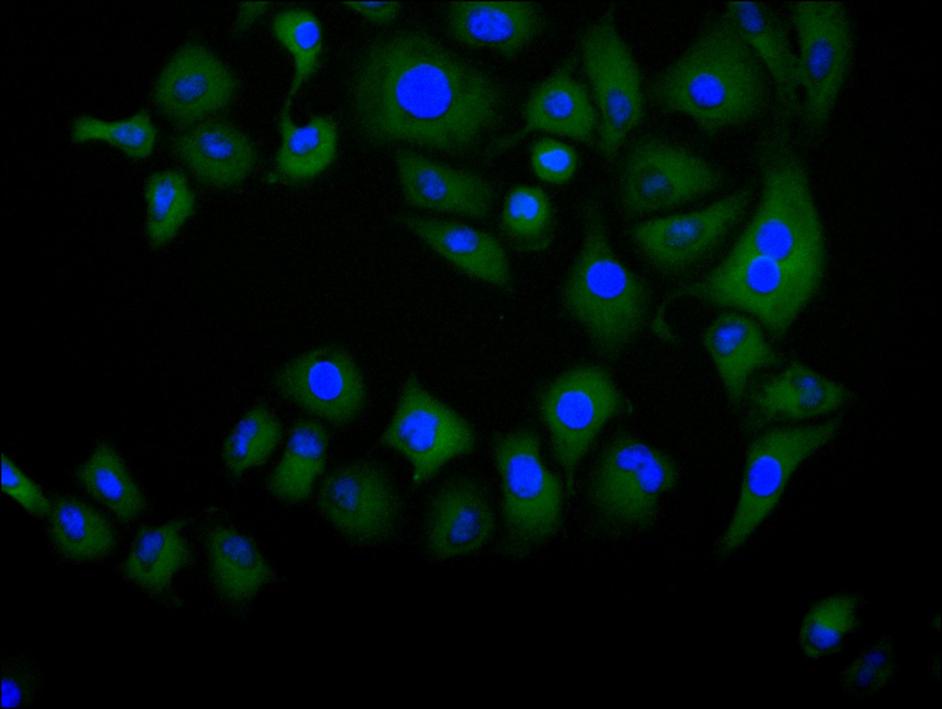Immunofluorescence staining of Hela cell with CSB-RA018072MA1HU at 1:30 ,counter-stained with DAPI. The cells were fixed in 4% formaldehyde, permeabilized using 0.2% Triton X-100 and blocked in 10% normal Goat Serum. The cells were then incubated with the antibody overnight at 4°C. The secondary antibody was Fluorescein (FITC) AffiniPure Goat Anti-Human IgG, Fcγ fragment specific.