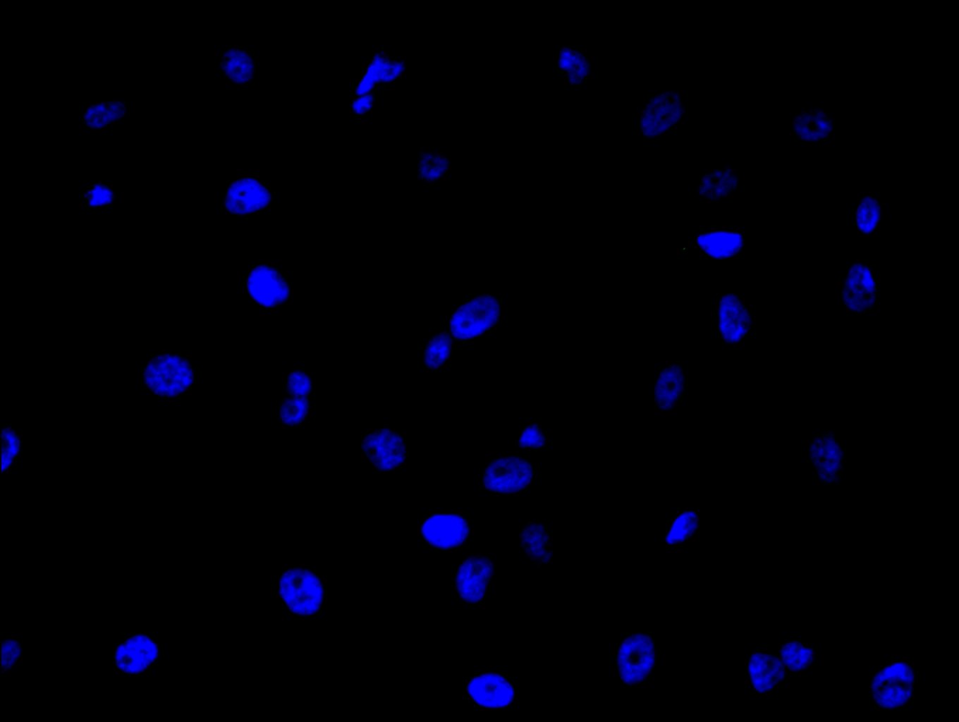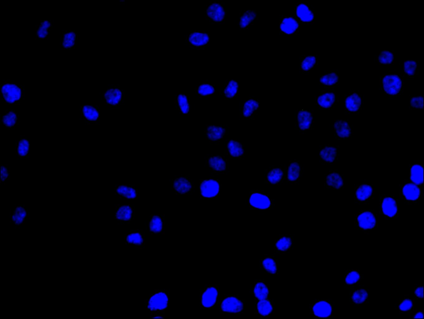 Immunofluorescence staining of Hela cell with 5% goat serum, counter-stained with DAPI. The cells were fixed in 4% formaldehyde and blocked in 10% normal Goat Serum. The cells were then incubated with the antibody overnight at 4C. The secondary antibody was Alexa Fluor 488-congugated AffiniPure Goat Anti-Rabbit IgG(H+L).