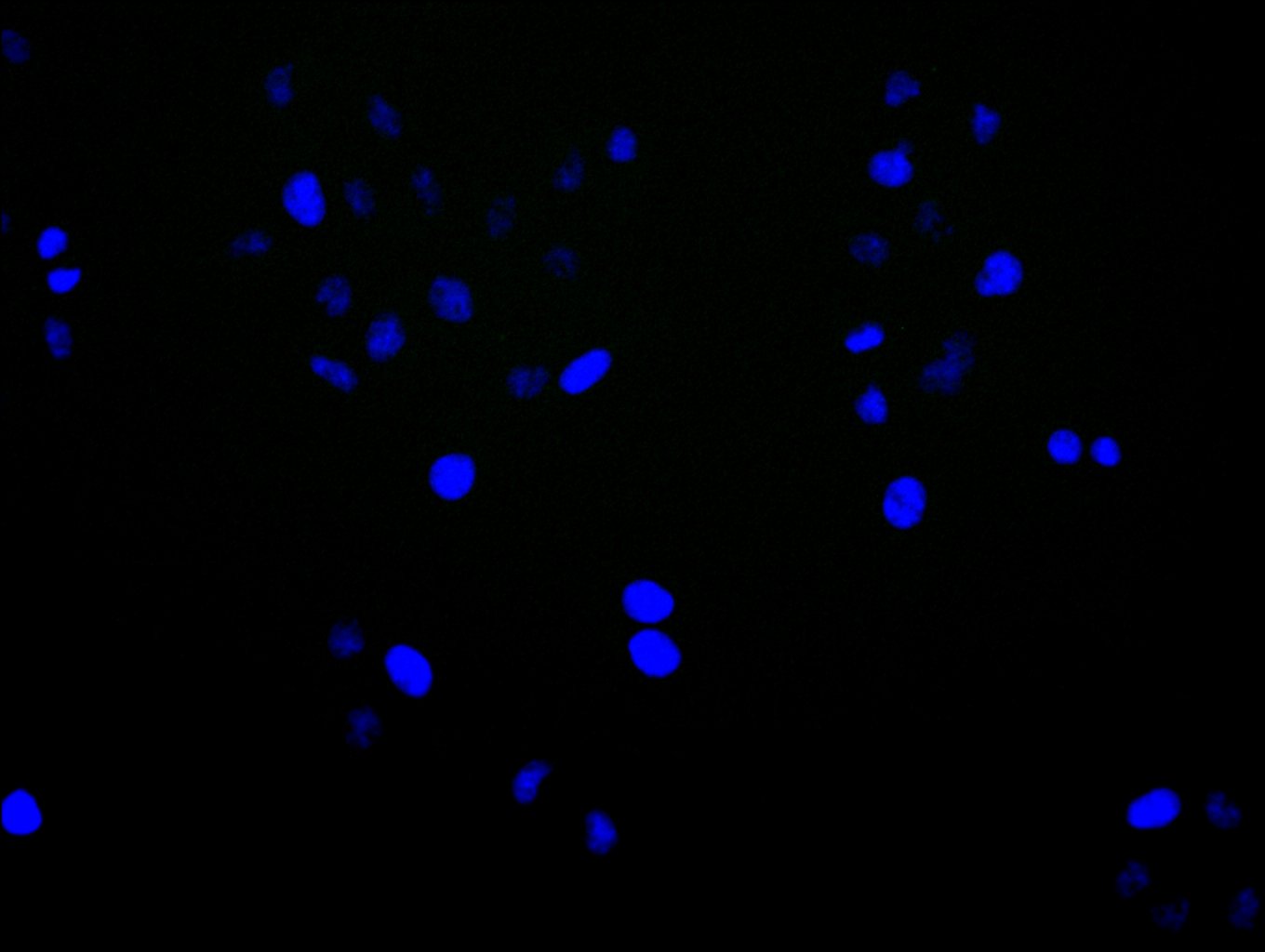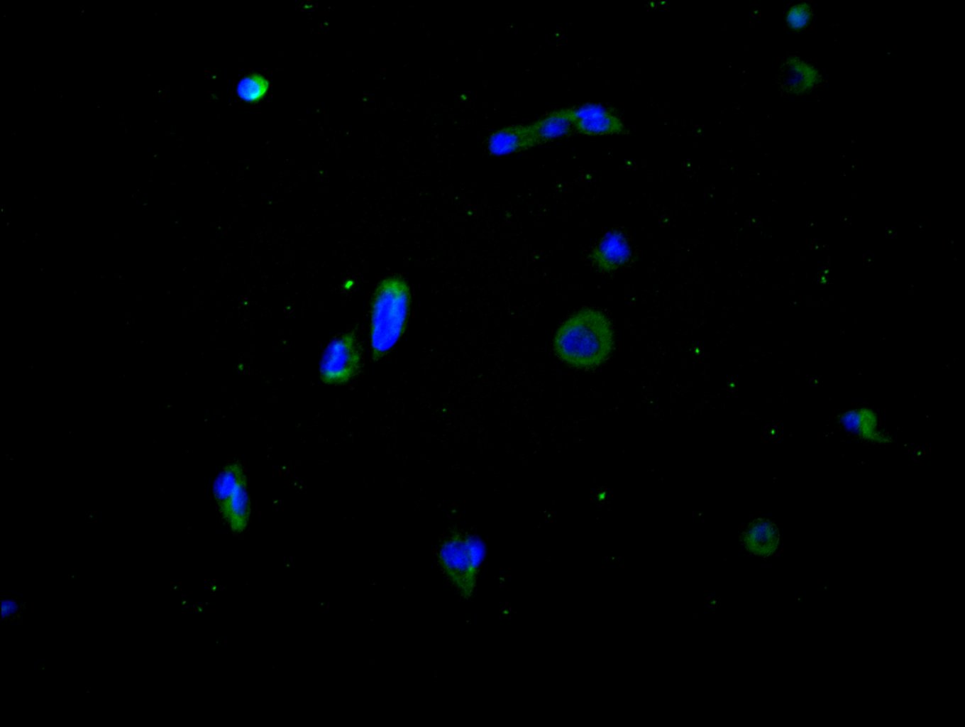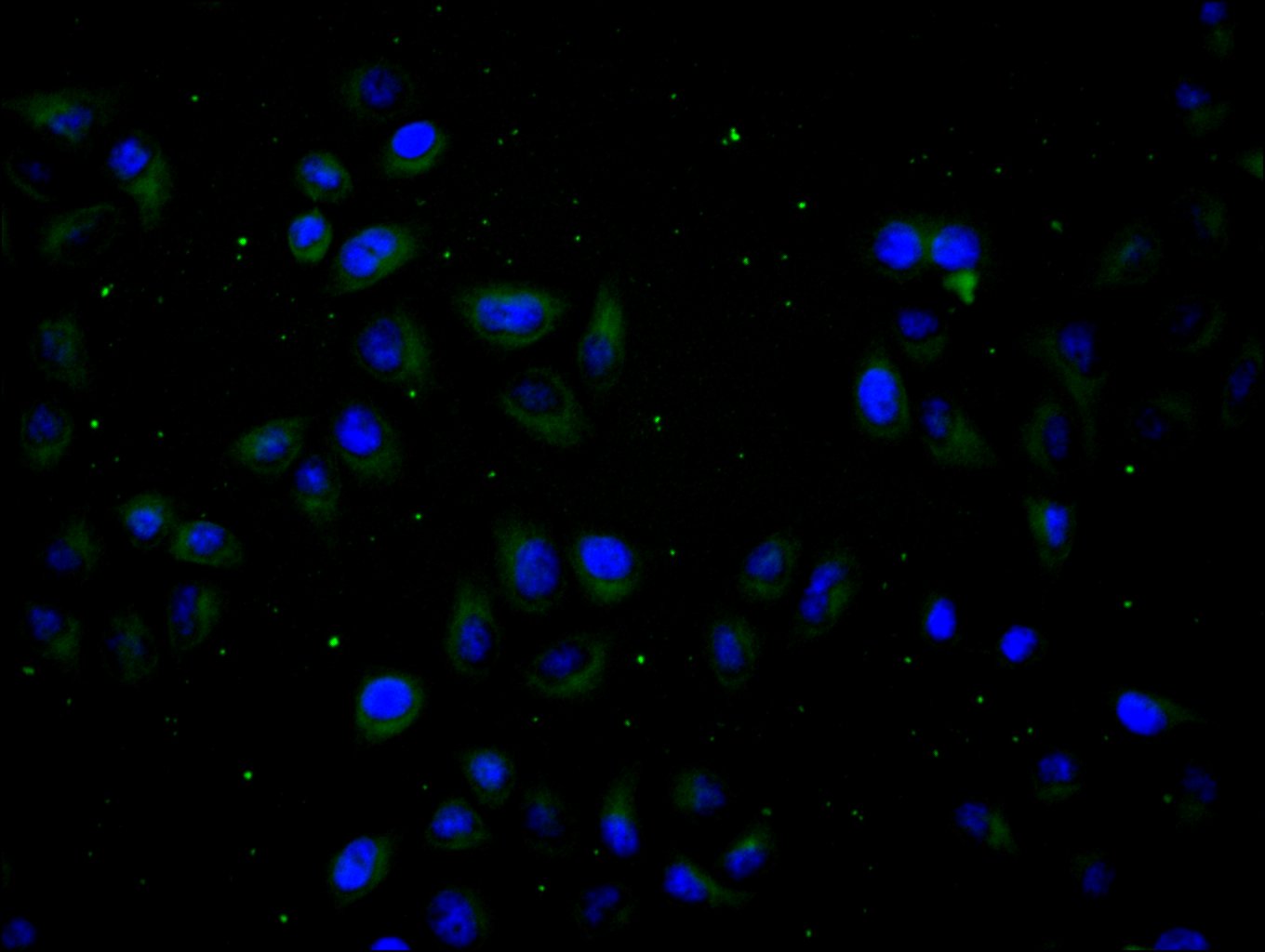 Immunofluorescence staining of HepG2 cell with 5% goat serum, counter-stained with DAPI. The cells were fixed in 4% formaldehyde and blocked in 10% normal Goat Serum. The cells were then incubated with the antibody overnight at 4C. The secondary antibody was Alexa Fluor 488-congugated AffiniPure Goat Anti-Rabbit IgG(H+L).
