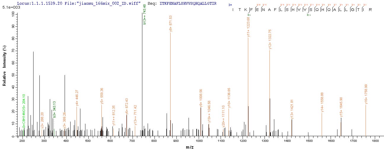 Based on the SEQUEST from database of E.coli host and target protein, the LC-MS/MS Analysis result of CSB-EP002344HUa2 could indicate that this peptide derived from E.coli-expressed Homo sapiens (Human) ATP5A1.