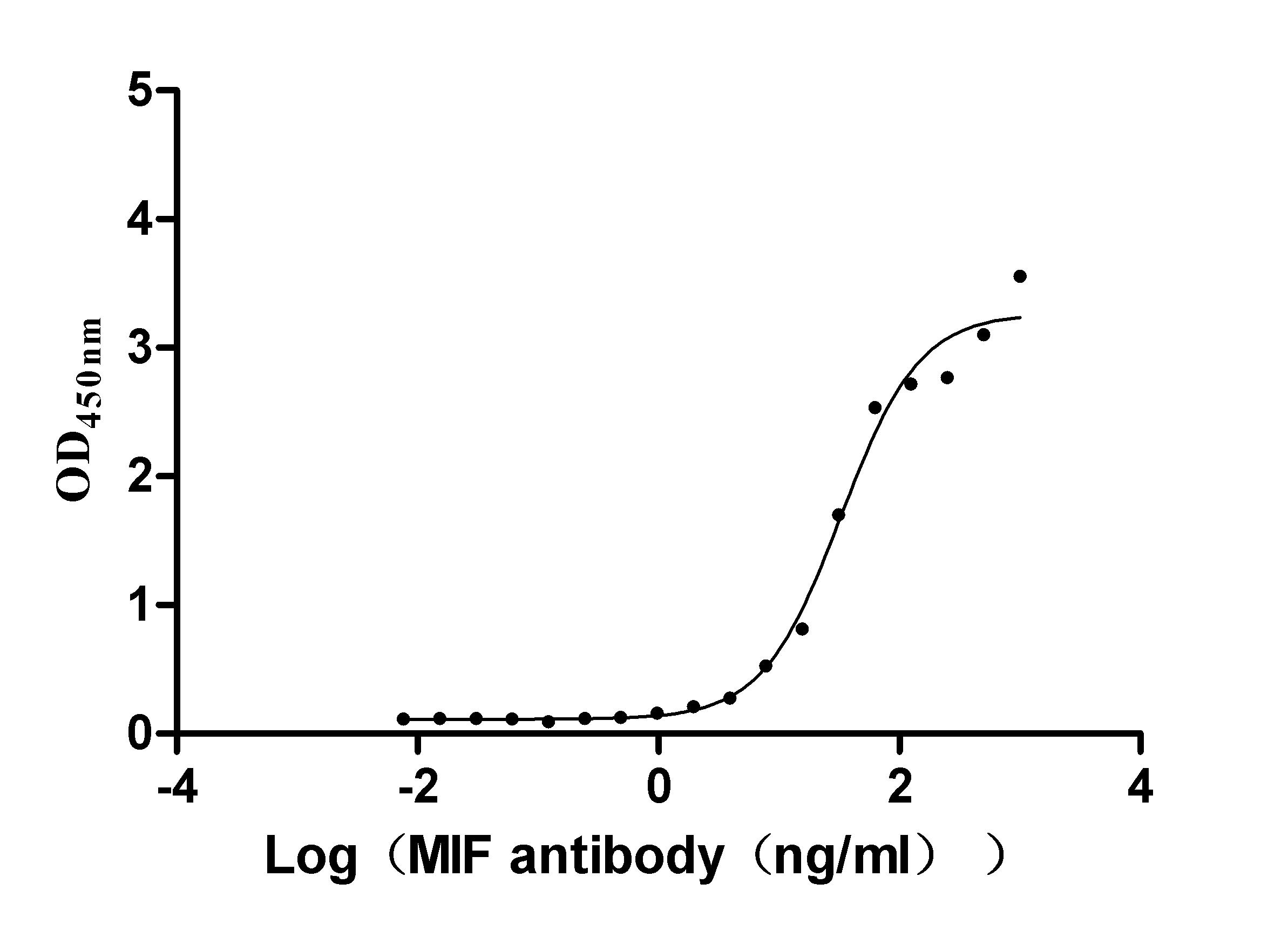 生物活性:①Measured by its binding ability in a functional ELISA. Immobilized MIF at 2 μg/ml can bind Anti- MIF Rabbit Monoclonal Antibody(CSB-RA146975A0HU), the EC50 is 49.61-69.45 ng/ml.