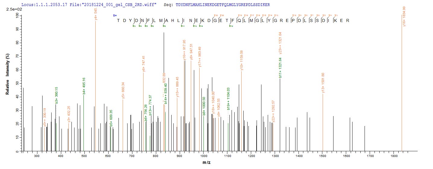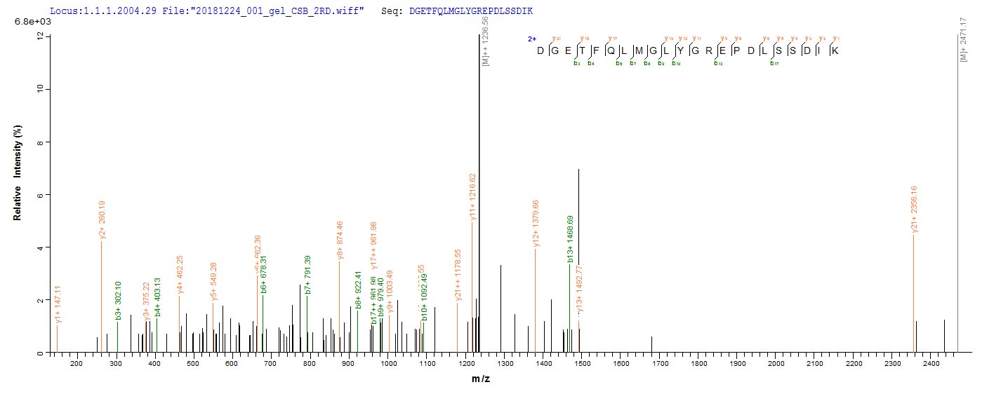 Based on the SEQUEST from database of E.coli host and target protein, the LC-MS/MS Analysis result of CSB-EP360881MO could indicate that this peptide derived from E.coli-expressed Mus musculus (Mouse) Mup6.