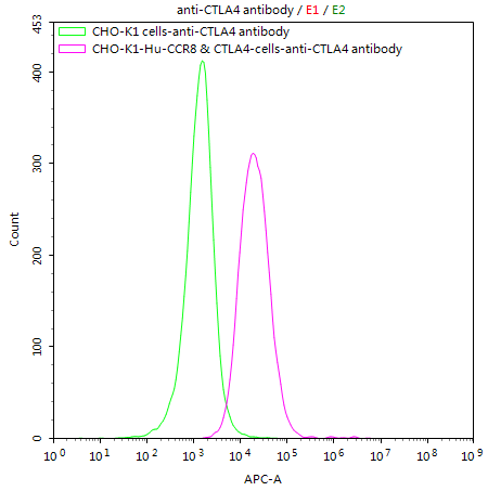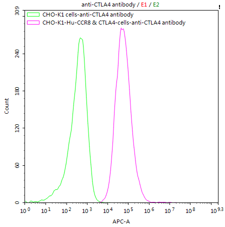 Untransfected CHO-K1 cells (green line) and transfected Human CCR8 & CTLA4 CHO-K1 stable cells (red line) were stained with anti-CTLA4 antibody (CSB-RA006163MA1HU) (2μg/1*106cells), washed and then followed by APC-conjugated anti-Mouse IgG Fc antibody and analyzed with flow cytometry