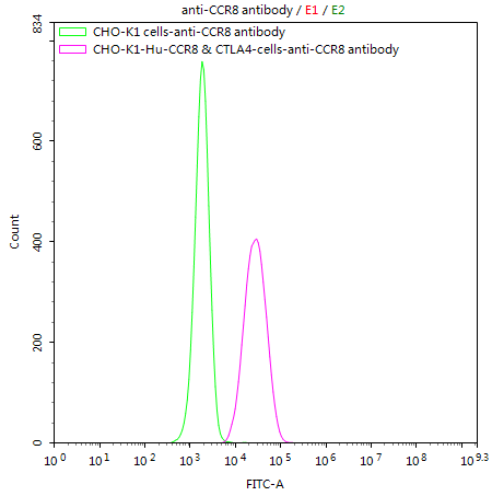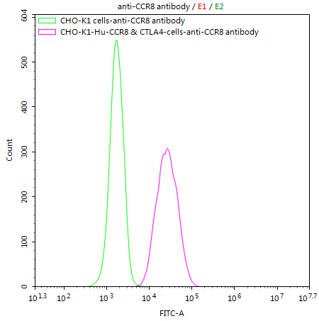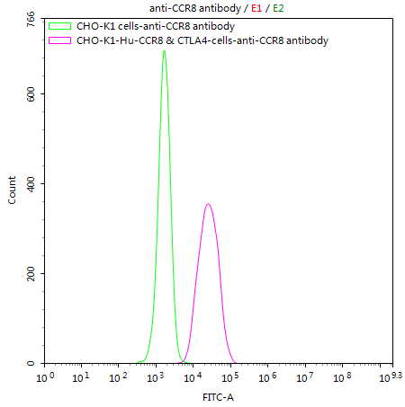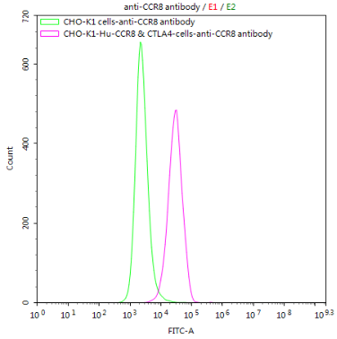 Untransfected CHO-K1 cells (green line) and transfected Human CCR8 & CTLA4 CHO-K1 stable cells (red line) were stained with anti-CCR8 antibody (CSB-RA004847MA3HU) (2μg/1*106cells), washed and then followed by FITC-conjugated anti-Human IgG Fc antibody and analyzed with flow cytometry.