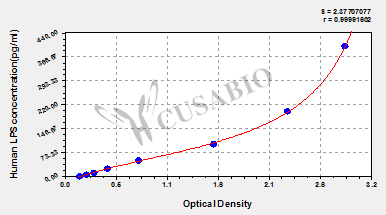 通過線性范圍來計算出實際的檢測樣本值,定量試劑盒標準曲線的相關系數R大于0.99。以CSB-E07270h(人脂聯素(ADP)ELISA Kit)為例的標準曲線。